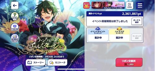 3/15~3/23 【萌芽*うつろいゆくエルミタージュ】Valkyrie新曲「Acanthe」お疲れさまでした。今回は自然回復+ホイッスル消費でリボンの数がちょうどいい感じになるように進めました。