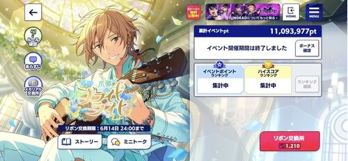 5/31~6/8 【祝辞*爪弾くブライドライト】UNDEAD新曲「Sustain Memories」お疲れさまでした。今回はリボン5000個以上+行けるところまで目標でした。結果的に1100万ptまで走れて満足です。とても疲れました。